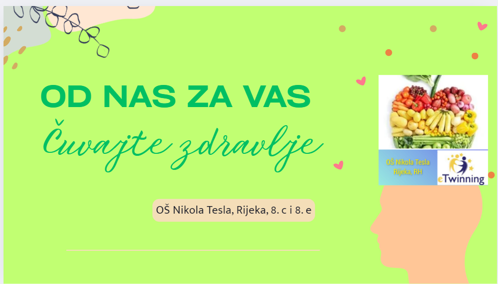 Učenici 8. c i 8. e razreda ove su školske godine uključeni u eTwnning projekt „Zdrave prehrambene navike 3“, koji nizom zanimljivih i interaktivnih aktivnosti motivira učenike na usvajanje zdravog načina života i pravilnih prehrambenih navika. U jednoj od prvih suradničkih aktivnosti naši su učenici projektnim partnerima ponudili prezentaciju koja promovira zdrav način života.