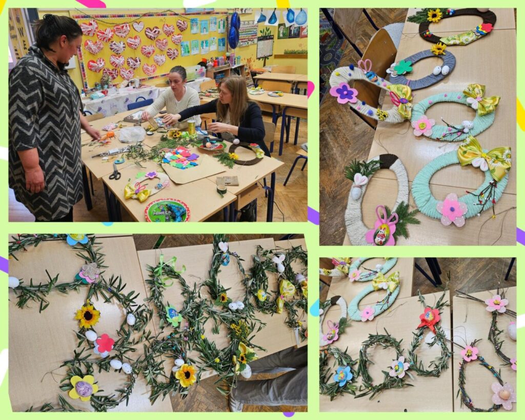 Na radionici su se izrađivali uskrsni vjenčići za vrata koristeći različite dekorativne materijale. Majke su s velikim interesom i kreativnošću sudjelovale u radu te dale vrijedan doprinos izradi proizvoda za sajam.