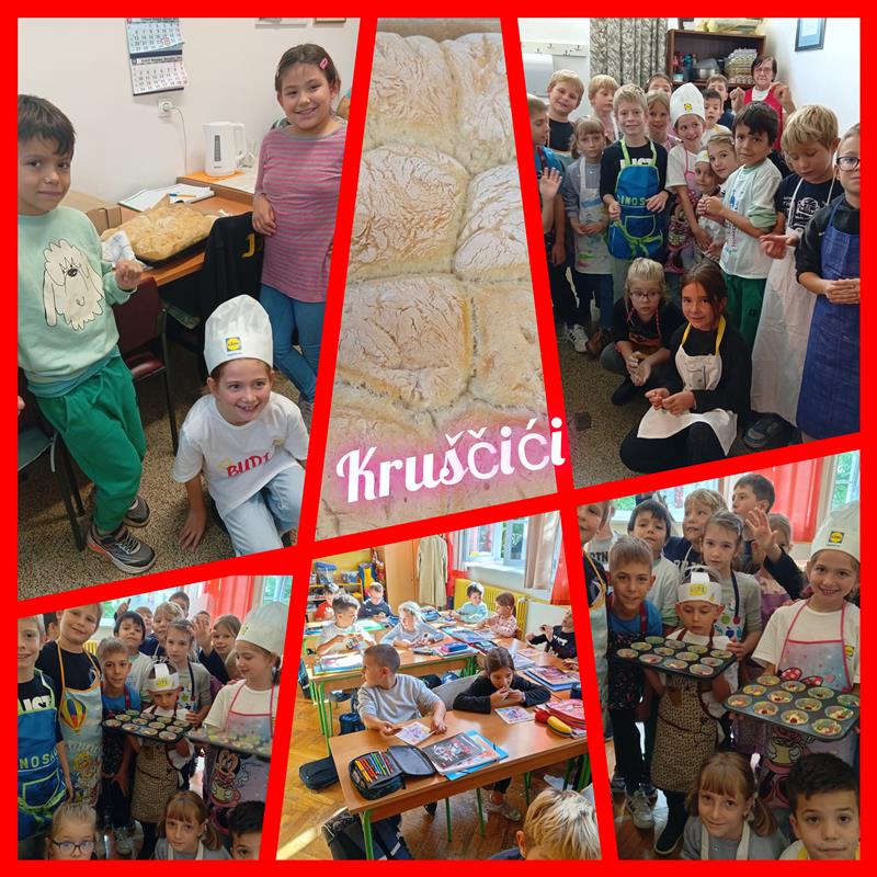 U petak 24. listopada učionicom 2. b širili su se mirisi kolača i kruha. Julija i njezin brat Lav pripremili su muffine, a svi zajedno i kruščiće. Bili su nam baš slasni!